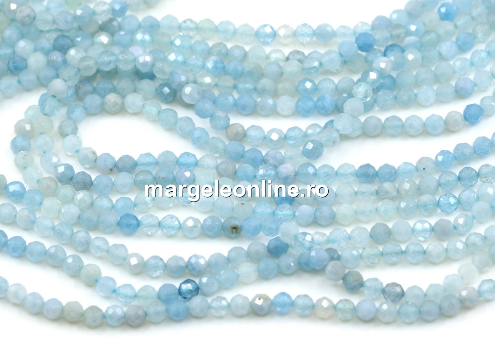 Margele acvamarin, forma: rotund fatetat, marime: 3mm, lungime sirag: 39cm. Pretul este pentru un sirag fara sistem de inchidere.