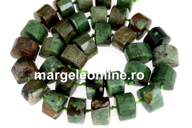 Margele jasp verde, forma: triunghi fatetat, marime: 15.5x15xx11mm. Pretul este pentru un sirag cu 33 margele. Pietrele sunt insirate pe mai multe ate asortate, iar firele de la capete sunt suficient de lungi incat sa le prindeti cu o incuietoare, colierul putand fi realizat in doar 2-3minute.