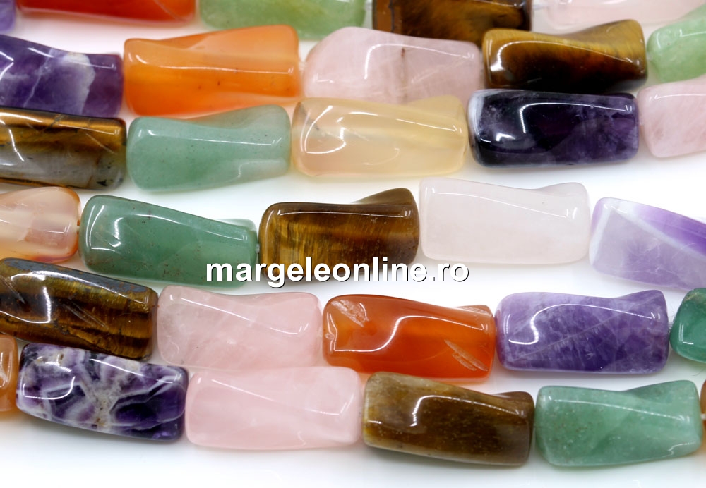 Margele mix ametist, cuart roz, aventurin, ochi de tigru, carneol, forma: tub rasucit, marime: 20x9mm, lungime sirag: 39cm. Pretul este pentru un sirag fara sistem de inchidere.