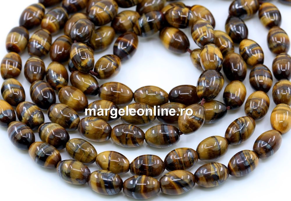 Margele Ochi de tigru maro, forma: butoias, marime: 10x7.5mm, lungime sirag: 39cm. Pretul este pentru un sirag fara sistem de inchidere.