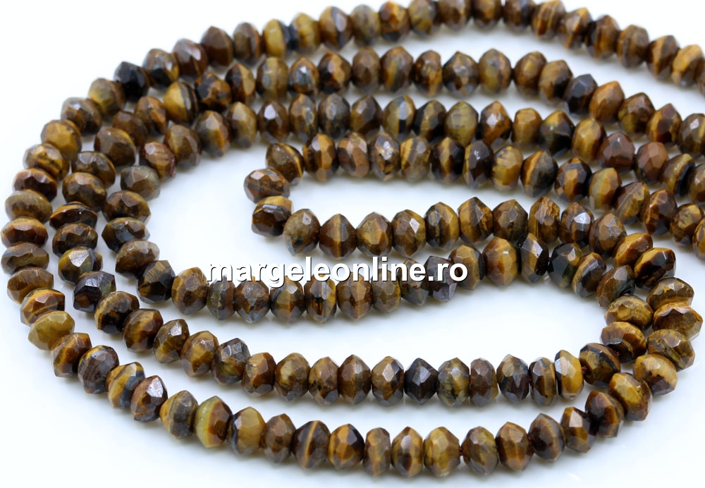 Margele Ochi de tigru maro, forma: rondele fatetate, marime: 6x3.5mm, lungime sirag: 39-40cm. Pretul este pentru un sirag fara sistem de inchidere.