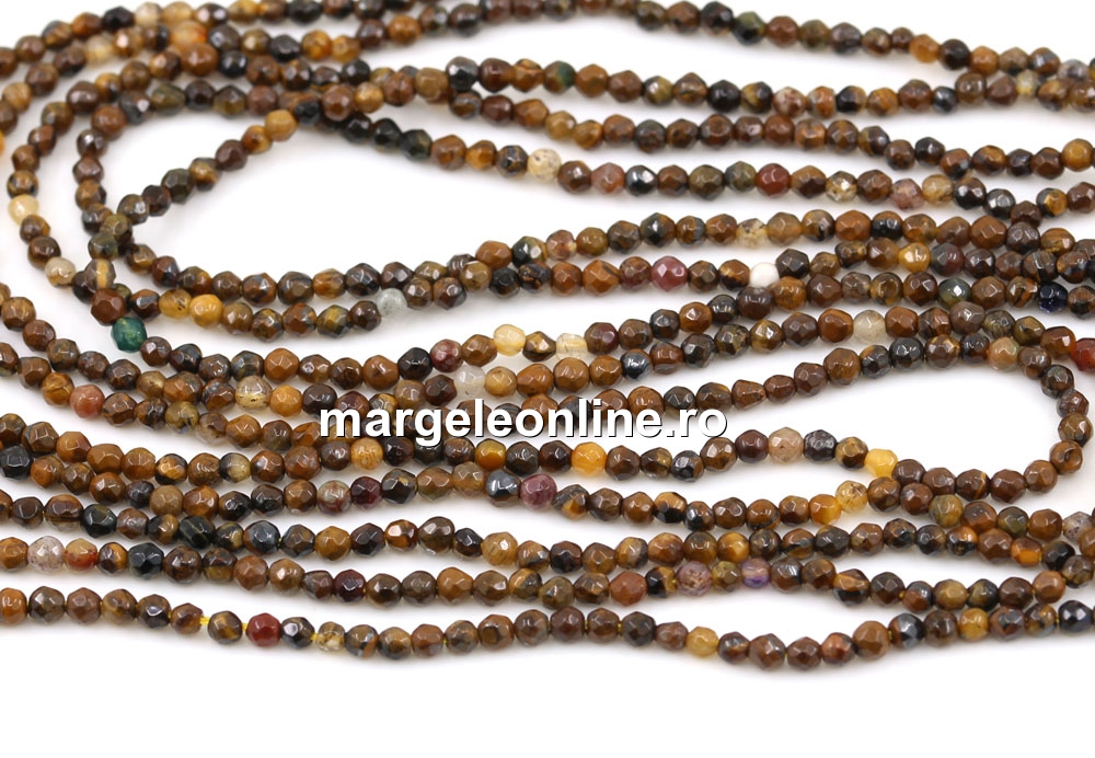 Margele ochi de tigru, forma: rotund fatetat, marime: 2.3mm, lungime sirag: 38cm. Pretul este pentru un sirag fara sistem de inchidere.