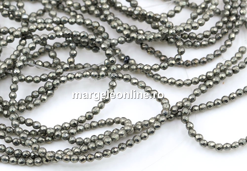 Margele pirita naturala, forma: rotund fatetat, marime: 2.2mm, lungime sirag: 39cm. Pretul este pentru un sirag fara sistem de inchidere.