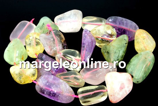 Mix cuart lemon, cuart roz, ametist, citrin si prehnite, marime: 20-28x14x18mm, forma: neregulata. Pretul se refera la un sirag de 40cm.