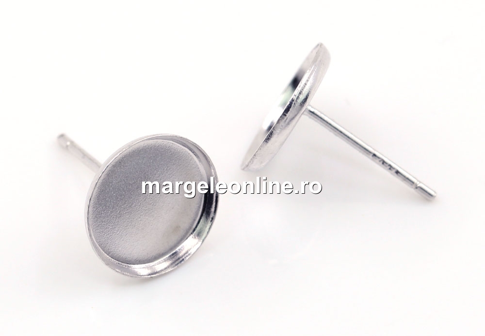Tortite cercei cu tija pentru cabochon 10mm, accesorii bijuterii argint 925 placat cu rodiu, marcat, dimensiune totala: 12x10mm, bordura: 1.4mm . Pretul este pentru 1 pereche.